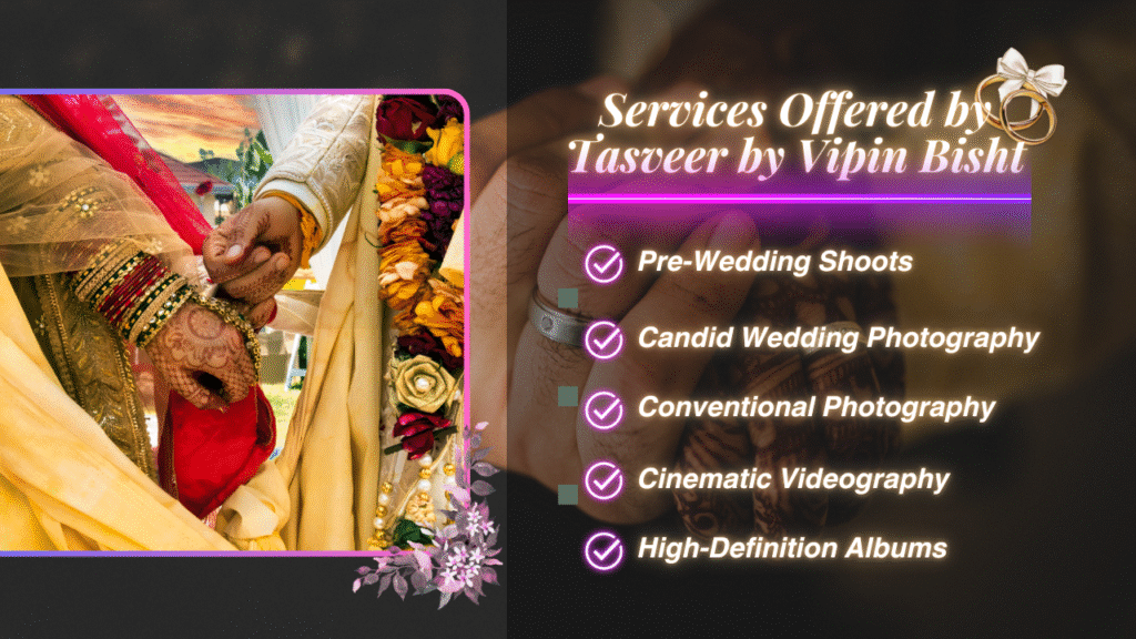 The main concern for couples is budget and price options. People may ask “how much will it cost to book the best wedding photographer in Haridwar with price?” With Tasveer by Vipin Bisht, you get multiple customized packages and completely transparent pricing for your requirements.